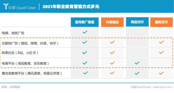以就業(yè)為導向的人才適應性提升 職業(yè)教育作為以就業(yè)為導向的教育方式,其適應性不僅只體現(xiàn)在人才培養(yǎng)上,還在于人才的管理和服務。 在人才培養(yǎng)的學歷階段,職業(yè)院校是主要的培養(yǎng)方,2021年10月中共中央辦公廳、國務院辦公廳印發(fā)《關于推動現(xiàn)代職業(yè)教育高質量發(fā)展的意見》就加快構建現(xiàn)代職業(yè)教育體系做出進一步的部署。人才適應能力的提升一方面來自于職業(yè)教育體系和普通教育體系的橫向融通和縱向貫通,打通升學渠道,另一方面則是面向市場,以企業(yè)崗位需求為目標,通過綜合的育人機制,改善職業(yè)教育學歷階段的人才供給結構。 企業(yè)則是通過校企合作和自主培養(yǎng),輸出資金、技術、實踐案例,吸納專業(yè)人才,強化品牌認知。 隨著靈活用工方式的出現(xiàn)從人員招聘、用工管理到員工技能培訓、權益保障都有對應的服務提供,人與崗位,人才與企業(yè)之間匹配的靈活性增加、時效性增強,帶來了人才服務效率的整體提升。 在線化職業(yè)教育服務交付 在線化服務交付,顧名思義,教育的在線化是社會經濟高質量飛躍、互聯(lián)網(wǎng)等技術成熟發(fā)展的必然結果,在不斷提高的互聯(lián)網(wǎng)普及率和新冠疫情的沖擊下,職業(yè)教育的全面在線化為行業(yè)升級的新成果。而招生營銷和教學形式的全面升級是職業(yè)教育在線化后表現(xiàn)最為突出的兩方面。