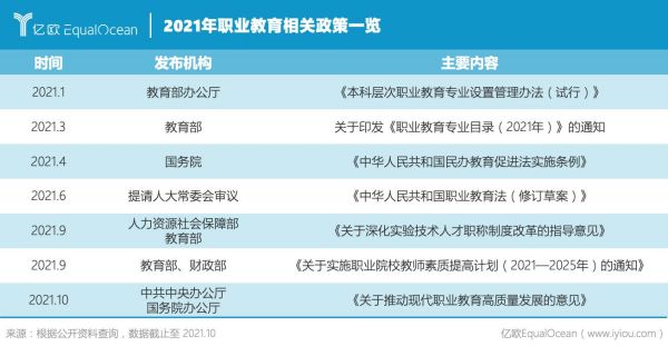 2021年,全國職業(yè)教育大會的召開,會議對職業(yè)教育工作做出重要指示,強調在全面建設社會主義現(xiàn)代化國家新征程中,職業(yè)教育前途廣闊、大有可為,無不體現(xiàn)出我國當前對職業(yè)教育的重視。