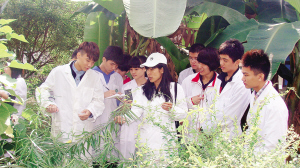 教師在藥用植物園指導(dǎo)學(xué)生識(shí)別藥用植物。