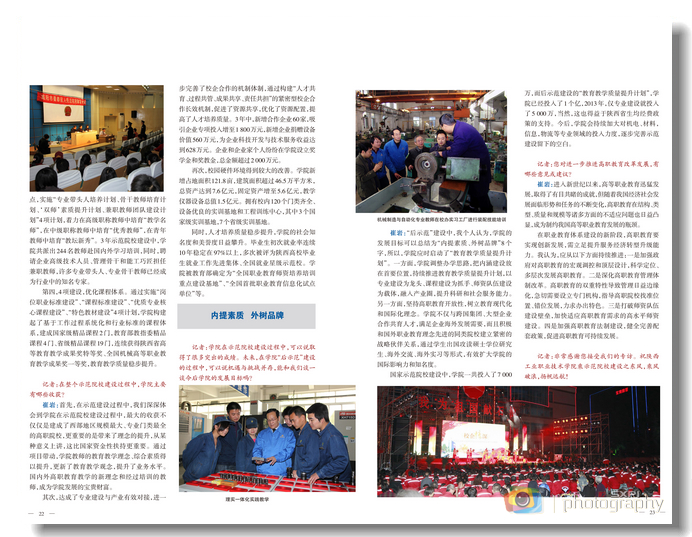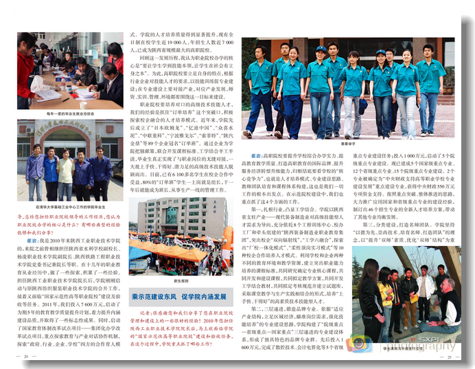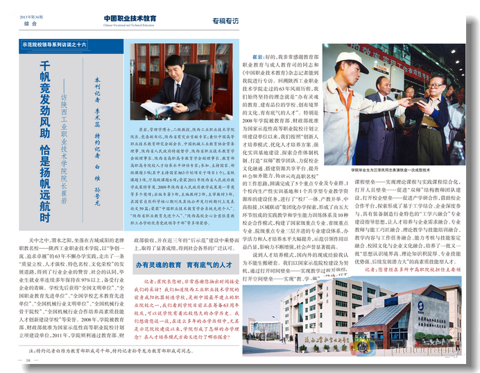 巖:好的,我也非常感謝教育部同志和《中國職業(yè)技術(shù)教育》雜志記者能專程到陜西工院進(jìn)行專訪?;厮蓐兾鞴I(yè)職業(yè)技術(shù)學(xué)院走過的63年風(fēng)雨歷程,用一句話說,我們的理念就是“辦有靈魂的教育、建有品位的學(xué)校、創(chuàng)有境界的文化、育有底氣的人才”。特別是2008年學(xué)院被教育部、財政部批準(zhǔn)為國家示范性高等職業(yè)院校計劃立項建設(shè)單位以來,我們按照“創(chuàng)新人才培養(yǎng)模式、優(yōu)化人才培養(yǎng)方案、強(qiáng)化實(shí)訓(xùn)基地建設(shè)、探索合作體制機(jī)制、打造雙師教學(xué)團(tuán)隊、力促校企文化融通、搭建資源共享平臺、提升社會服務(wù)能力、鑄就示范高職名?!钡墓ぷ魉悸?,圓滿完成了5個重點(diǎn)專業(yè)及專業(yè)群、1個校內(nèi)生產(chǎn)性實(shí)訓(xùn)基地和1個共享型專業(yè)教學(xué)資源庫的建設(shè)任務(wù),進(jìn)行了“校廠一體、產(chǎn)教并舉、中高銜接、區(qū)域聯(lián)動”集團(tuán)化辦學(xué)探索,形成了由五大環(huán)節(jié)組成的實(shí)踐教學(xué)和學(xué)生能力訓(xùn)練體系及十種校企合作模式,構(gòu)建了國家級重點(diǎn)專業(yè)、省級重點(diǎn)專業(yè)、院級重點(diǎn)專業(yè)三層并進(jìn)的專業(yè)建設(shè)體系,辦學(xué)活力和人才培養(yǎng)水平大幅提升,示范引領(lǐng)作用日益凸顯,影響力不斷增強(qiáng),社會聲譽(yù)顯著提高。
