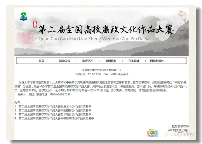 為深入學(xué)習(xí)貫徹落實(shí)黨的十八大精神和中央關(guān)于黨風(fēng)廉政建設(shè)和反腐敗工作的新部署新要求,教育部思政司、紀(jì)檢組監(jiān)察局以“中國夢·廉潔情”為主題,聯(lián)合舉辦了第二屆全國高校廉政文化作品大賽。共評(píng)選出表演藝術(shù)類、書畫攝影類、藝術(shù)設(shè)計(jì)類、網(wǎng)絡(luò)新媒體類4大類作品一、二、三等獎(jiǎng)328項(xiàng)。陜西工院認(rèn)真組織,積極參與,創(chuàng)作和遴選了6部優(yōu)秀作品參加角逐,共獲得國家級(jí)三等獎(jiǎng)2項(xiàng),省級(jí)二等獎(jiǎng)2項(xiàng)、三等獎(jiǎng)3項(xiàng)。
