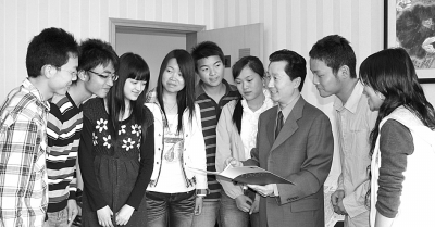 內(nèi)江師范學院院長謝峰教授課外在與學生親切交流