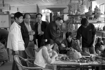 中國(guó)工藝美術(shù)大師李人帡(左二)指導(dǎo)欽州學(xué)院坭興陶專業(yè)學(xué)生實(shí)習(xí)。