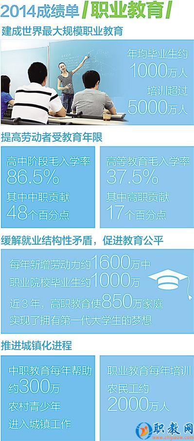 目前,中國(guó)特色現(xiàn)代職業(yè)教育發(fā)展道路初步形成,服務(wù)經(jīng)濟(jì)社會(huì)發(fā)展和人的全面發(fā)展的能力大幅提升。2014年,全國(guó)共有職業(yè)院校1.33萬(wàn)所,年招生966.83萬(wàn)人,在校生2809.53萬(wàn)人?!笆濉币詠?lái),職業(yè)院校共培養(yǎng)近5000萬(wàn)畢業(yè)生。近年來(lái)一些熱門(mén)行業(yè)新增從業(yè)人員中,職業(yè)院校畢業(yè)生占70%以上。