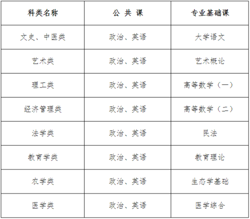 專升本考試科目為三門。兩門公共課為政治、英語,一門專業(yè)基礎(chǔ)課根據(jù)招生專業(yè)所隸屬的學(xué)科門類確定。