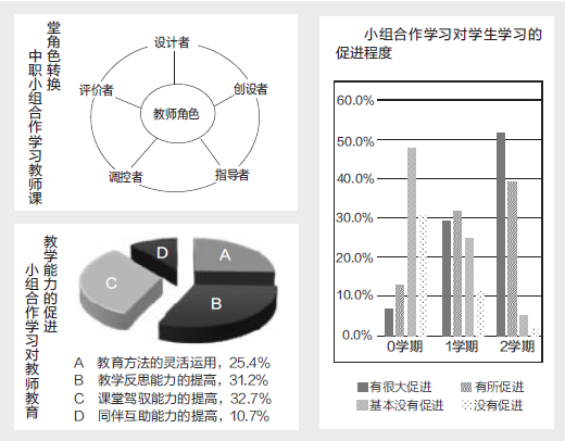 教師角色的成功轉(zhuǎn)型。傳統(tǒng)教學(xué)中,教師扮演“權(quán)威”、傳話者、控制者等角色,強(qiáng)調(diào)指令和服從,對(duì)學(xué)生單向灌輸知識(shí),體現(xiàn)教師主導(dǎo)地位。湖州市中職小組合作學(xué)習(xí)中,一切以學(xué)生為中心,一切為了學(xué)生的學(xué)習(xí),教師轉(zhuǎn)變角色,在課堂上成為合作任務(wù)的設(shè)計(jì)者、合作情景的創(chuàng)設(shè)者、合作活動(dòng)的指導(dǎo)者、合作過程的調(diào)控者、合作表現(xiàn)的評(píng)價(jià)者。