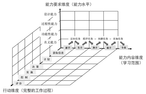 在能力內(nèi)容維度中,按照職業(yè)成長邏輯規(guī)律理論,職業(yè)發(fā)展過程分為了初學者、高級初學者、有能力者、熟練者和專家五個階段,對應的職業(yè)學習內(nèi)容則分為四個范圍:范圍一是職業(yè)入門教育,即學習本職業(yè)(專業(yè))的基本工作內(nèi)容,了解職業(yè)輪廓,完成從職業(yè)選擇向職業(yè)工作世界過渡并初步建立職業(yè)認同感。范圍二是職業(yè)關聯(lián)性教育,學生對工作系統(tǒng)、綜合性任務和復雜設備要建立整體性的認識,掌握與職業(yè)相關聯(lián)的知識,了解生產(chǎn)流程和設備運作,思考人與人之間的關系以及技術與勞動組織間的關系,獲取初步工作經(jīng)驗并開始建立職業(yè)責任感。范圍三是職業(yè)功能性教育,學生要掌握與復雜工作任務相對應的功能性知識,完成非常規(guī)性任務(如故障診斷)并促進合作能力的進一步發(fā)展,成長為初步的專業(yè)人員并形成較高的職業(yè)責任感。范圍四是知識系統(tǒng)化的專業(yè)教育,學生需完成結(jié)果不可預見的工作任務,建立學科知識與工作實踐的聯(lián)系,并發(fā)展組織能力和研究性學習的能力。