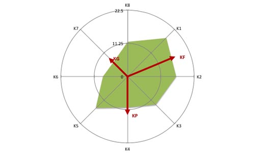 KF=功能性能力,KP=過程性能力,KG=整體設計能力;K1=直觀性和展示性,K2=功能性,K3=使用價值導向,K4=經(jīng)濟性,K5=經(jīng)營過程/生產(chǎn)流程與工作過程導向,K6=社會接受度/社會相容性,K7=環(huán)保性,K8=創(chuàng)造性;GPW為達到的能力總分的平均分, V為變異系數(shù)。