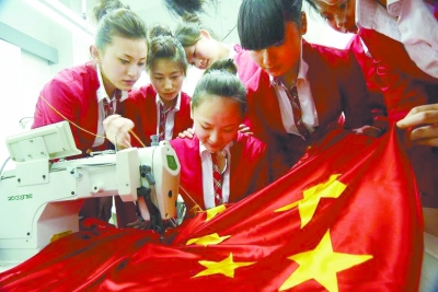 寧波甬江職業(yè)高級(jí)中學(xué)服裝專業(yè)的同學(xué),學(xué)習(xí)“江姐”繡紅旗,把對(duì)祖國的愛和對(duì)中國夢(mèng)的憧憬繡進(jìn)五星紅旗里。孫海巖 攝