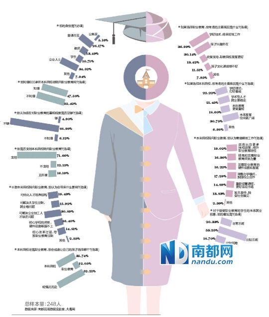 日前,南都民調(diào)數(shù)據(jù)實(shí)驗(yàn)室聯(lián)合大粵網(wǎng)推出網(wǎng)絡(luò)問(wèn)卷調(diào)查,截至昨日中午共計(jì)248名網(wǎng)友參與調(diào)查。結(jié)果顯示,逾7成受訪者支持本科院校轉(zhuǎn)向職業(yè)教育,并對(duì)職業(yè)教育的學(xué)生未來(lái)就業(yè)表示樂(lè)觀。本科院校和高職院校選哪個(gè),5成多受訪者表示“視情況而定”,35 .7%表示會(huì)選擇“本科院?!?。