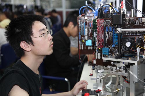 校企共建實(shí)訓(xùn)室。近兩年,企業(yè)主動(dòng)捐建和與學(xué)院共建校內(nèi)實(shí)驗(yàn)室6個(gè)、研究所3個(gè),共建共管校外實(shí)訓(xùn)基地22家。2013年7月,集團(tuán)內(nèi)成員企業(yè)廣鐵集團(tuán)長(zhǎng)沙供電段與學(xué)院簽署共建協(xié)議,由長(zhǎng)沙供電段提供一臺(tái)鐵路接觸網(wǎng)作業(yè)車給學(xué)院,建設(shè)“接觸網(wǎng)練兵實(shí)訓(xùn)基地”,為電氣化鐵道供電專業(yè)學(xué)生和員工提供專業(yè)技能實(shí)訓(xùn)練兵場(chǎng)地、相關(guān)專業(yè)課程實(shí)訓(xùn)場(chǎng)地和實(shí)驗(yàn)教學(xué)場(chǎng)地。珠海偉創(chuàng)力公司提供SMT生產(chǎn)設(shè)備,捐建電子產(chǎn)品生產(chǎn)實(shí)訓(xùn)室;廣東佛山南海益晶科技公司提供生產(chǎn)設(shè)備,與學(xué)院共同籌建校內(nèi)半導(dǎo)體存儲(chǔ)器測(cè)試生產(chǎn)車間;上海ABB工程有限公司正在與學(xué)院協(xié)商共建工業(yè)機(jī)器人應(yīng)用技術(shù)創(chuàng)新中心。
