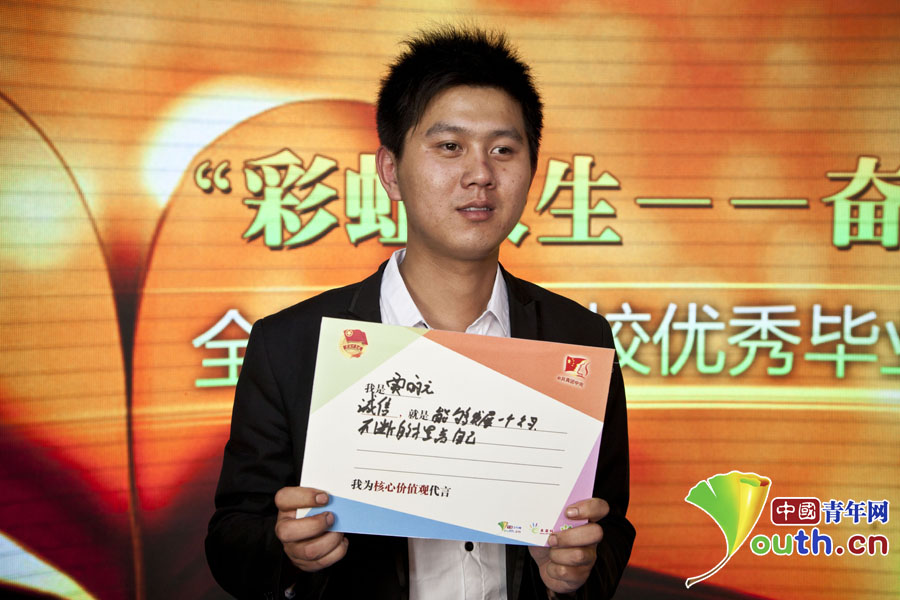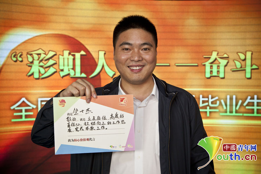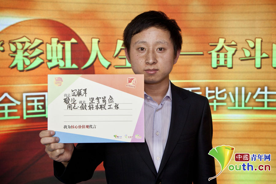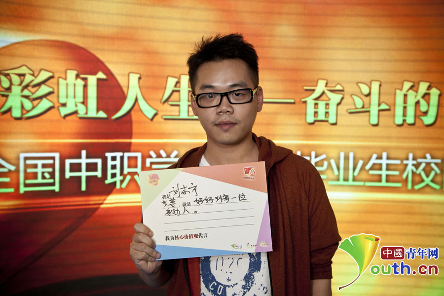 “彩虹人生——奮斗的青春最美麗”分享團成員,江門市新會區(qū)方塊動漫科技有限公司經(jīng)理劉志方寫下自己的“價值觀體”?!?/p>