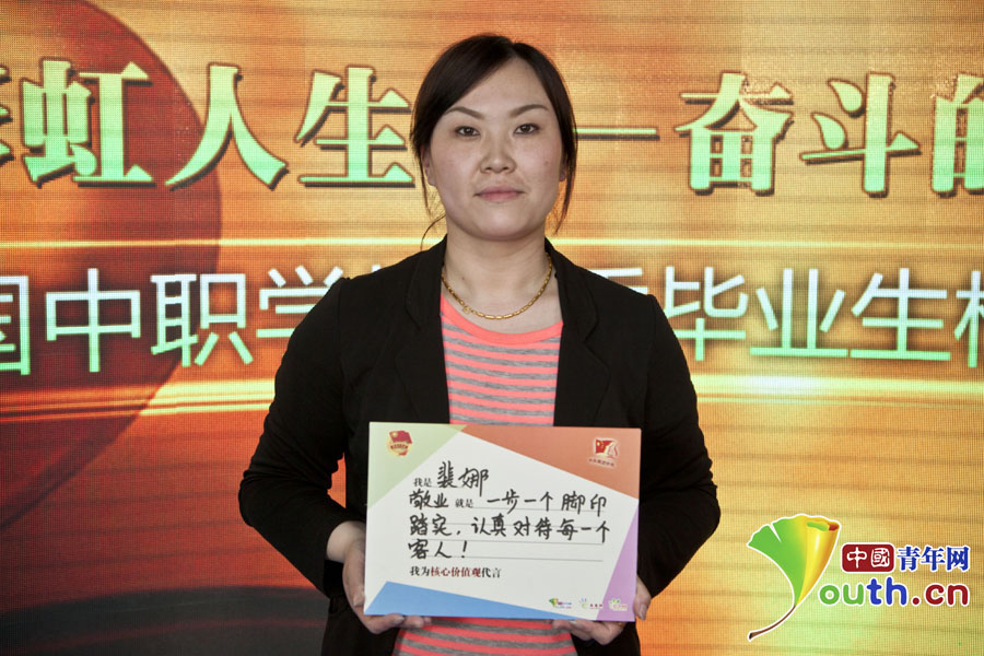 “彩虹人生——奮斗的青春最美麗”分享團成員,天津津利華酒店服務(wù)員裴娜寫下自己的“價值觀體”。