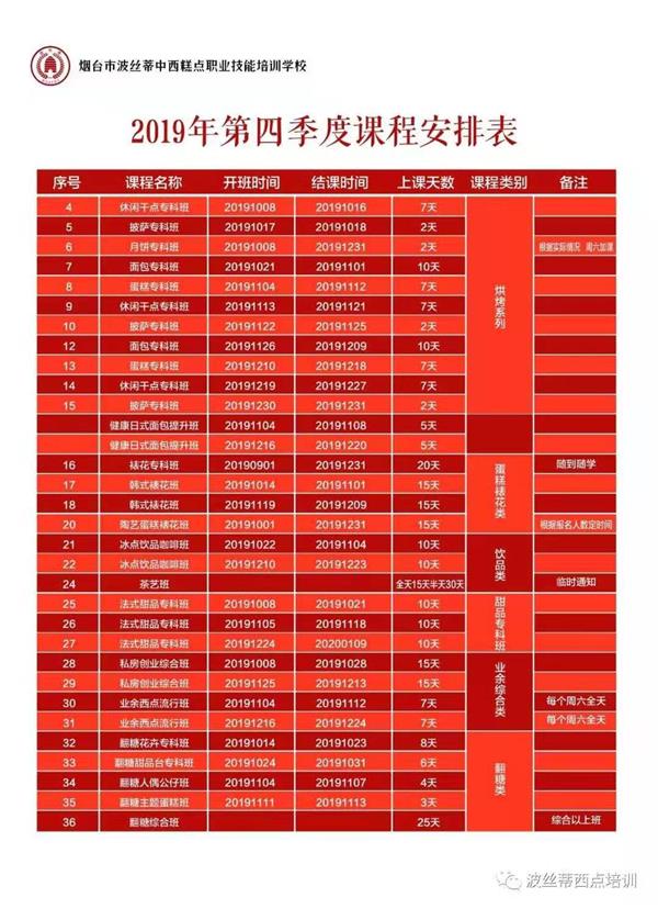 ??煙臺(tái)市波絲蒂中西糕點(diǎn)職業(yè)技能培訓(xùn)學(xué)校創(chuàng)立于2004年,是中西糕點(diǎn)專業(yè)培訓(xùn)機(jī)構(gòu),是煙臺(tái)市人力資源和社會(huì)保障局指定的正規(guī)技能培訓(xùn)基地,西點(diǎn)課程設(shè)置全面:面包??瓢?、蛋糕專科班、月餅??瓢?、休閑干點(diǎn)班、披薩??瓢?、裱花??瓢?、法式西點(diǎn)班等等。