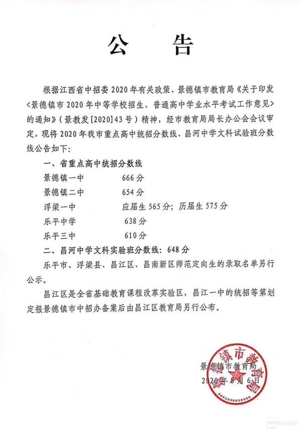 2020年江西景德鎮(zhèn)中考重點高中統(tǒng)招分?jǐn)?shù)線公布