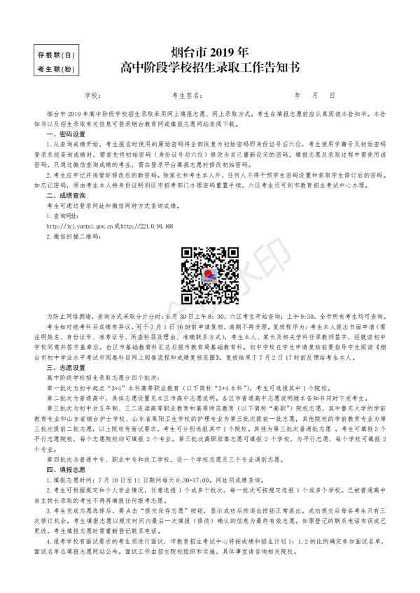 2019年山東煙臺中考普通高中招生錄取告知書公布了,招生錄取時(shí)間:7月17日至7月23日。具體內(nèi)容如下所示: