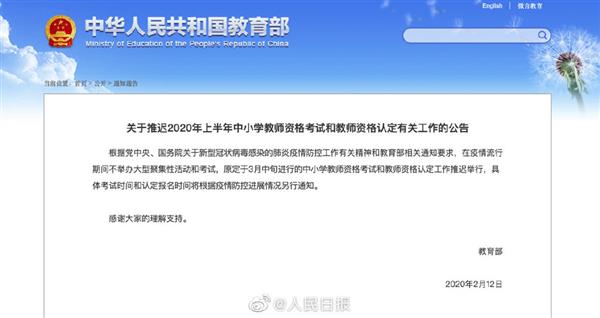 教育部:推遲中小學(xué)教師資格考試和認(rèn)定
