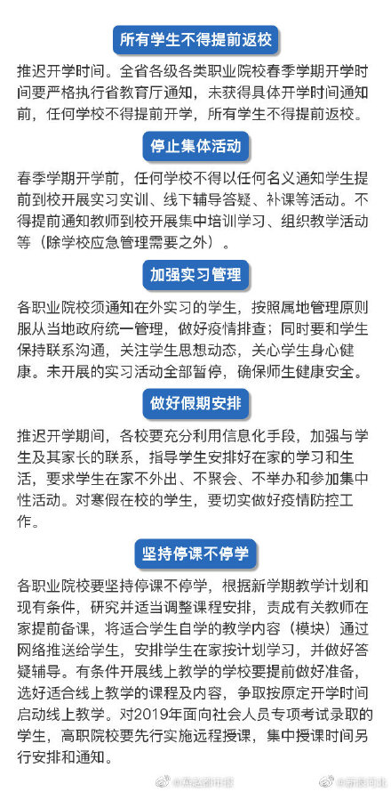 任何學(xué)校不得提前開學(xué),所有學(xué)生不得提前返校,停止集體活動…近日,河北省教育廳發(fā)布關(guān)于做好職業(yè)院校因新型冠狀病毒疫情延期開學(xué)有關(guān)教育教學(xué)工作的通知。